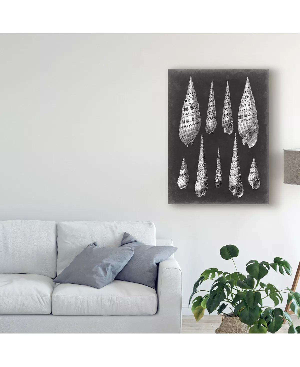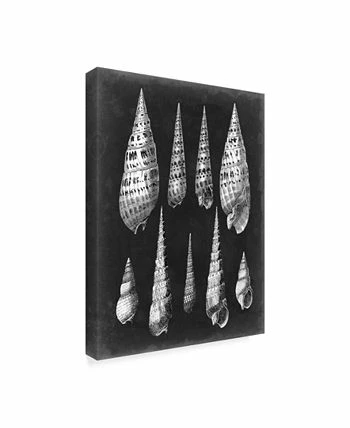 This ready to hang, gallery-wrapped art piece features white shells over a dark background. Gallery-wrap is a method of wrapping an artist’s canvas around a hidden, wooden frame allowing for a frameless presentation.