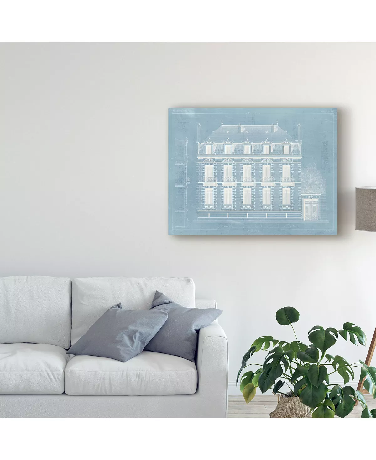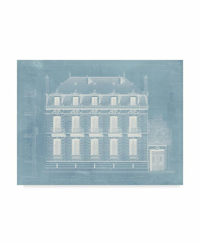 This ready to hang, gallery-wrapped art piece features a white industrial drawing of a French home. Gallery-wrap is a method of wrapping an artist’s canvas around a hidden, wooden frame allowing for a frameless presentation.