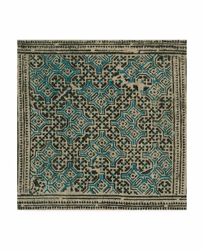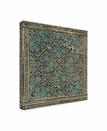 This ready to hang, gallery-wrapped art piece features tan fabric with a black and teal geometric design. Gallery-wrap is a method of wrapping an artist’s canvas around a hidden, wooden frame allowing for a frameless presentation.