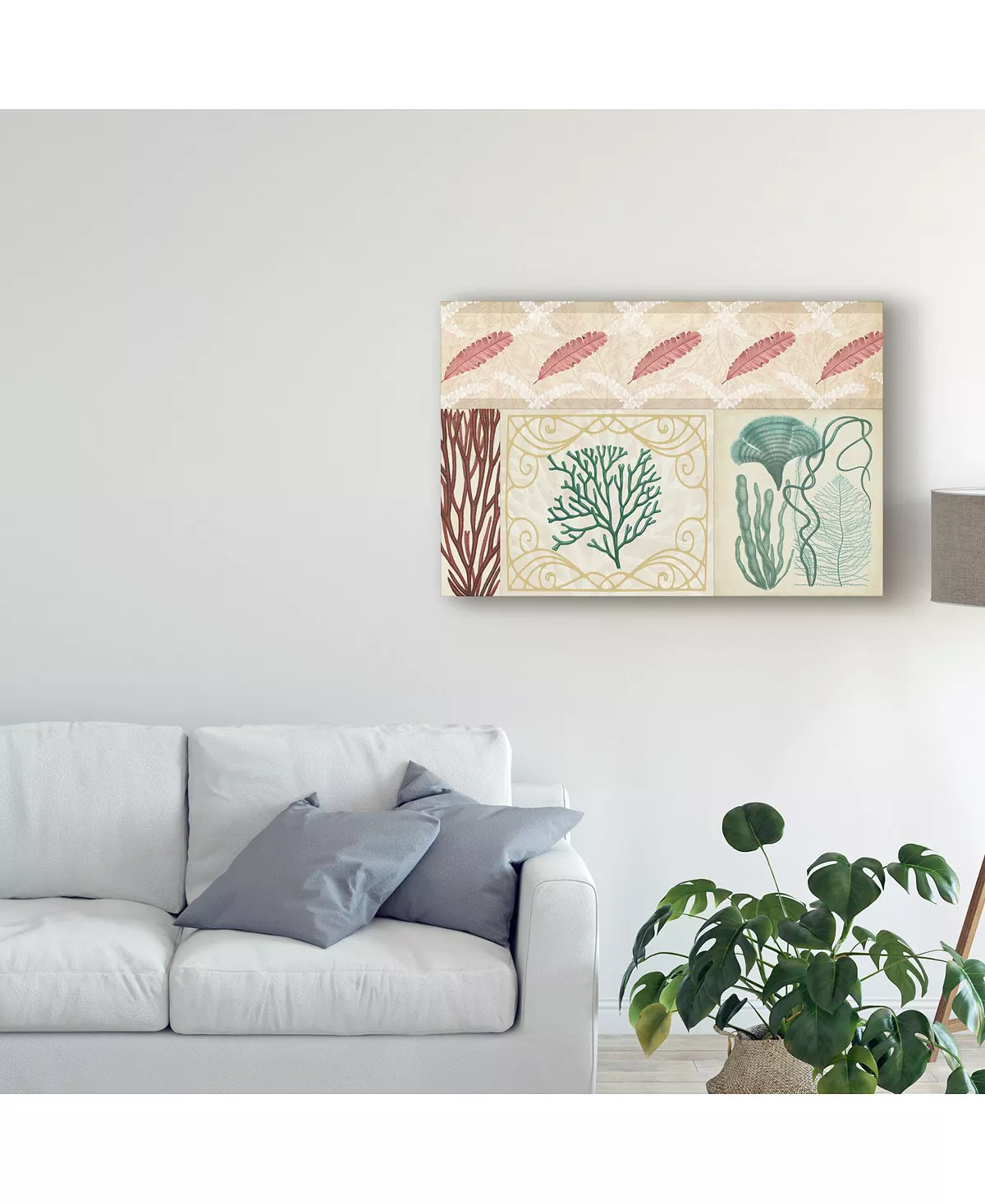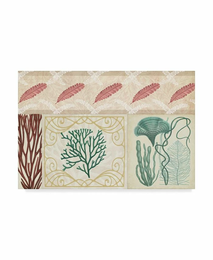 This ready to hang, gallery-wrapped art piece features red and blue coral over a pattern. Gallery-wrap is a method of wrapping an artist’s canvas around a hidden, wooden frame allowing for a frameless presentation.