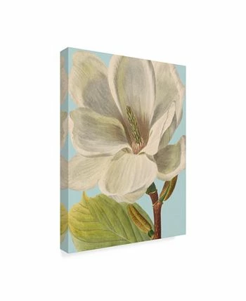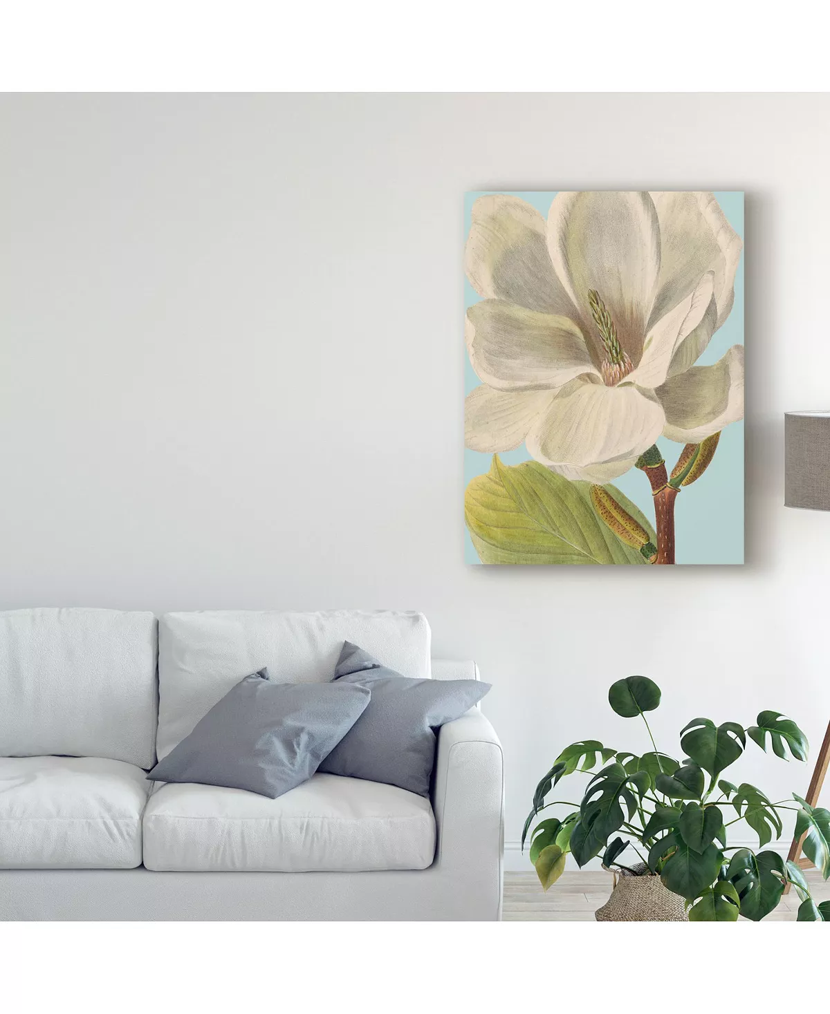 This ready to hang, gallery-wrapped art piece features a large white flower in the center of the frame. Gallery-wrap is a method of wrapping an artist’s canvas around a hidden, wooden frame allowing for a frameless presentation.