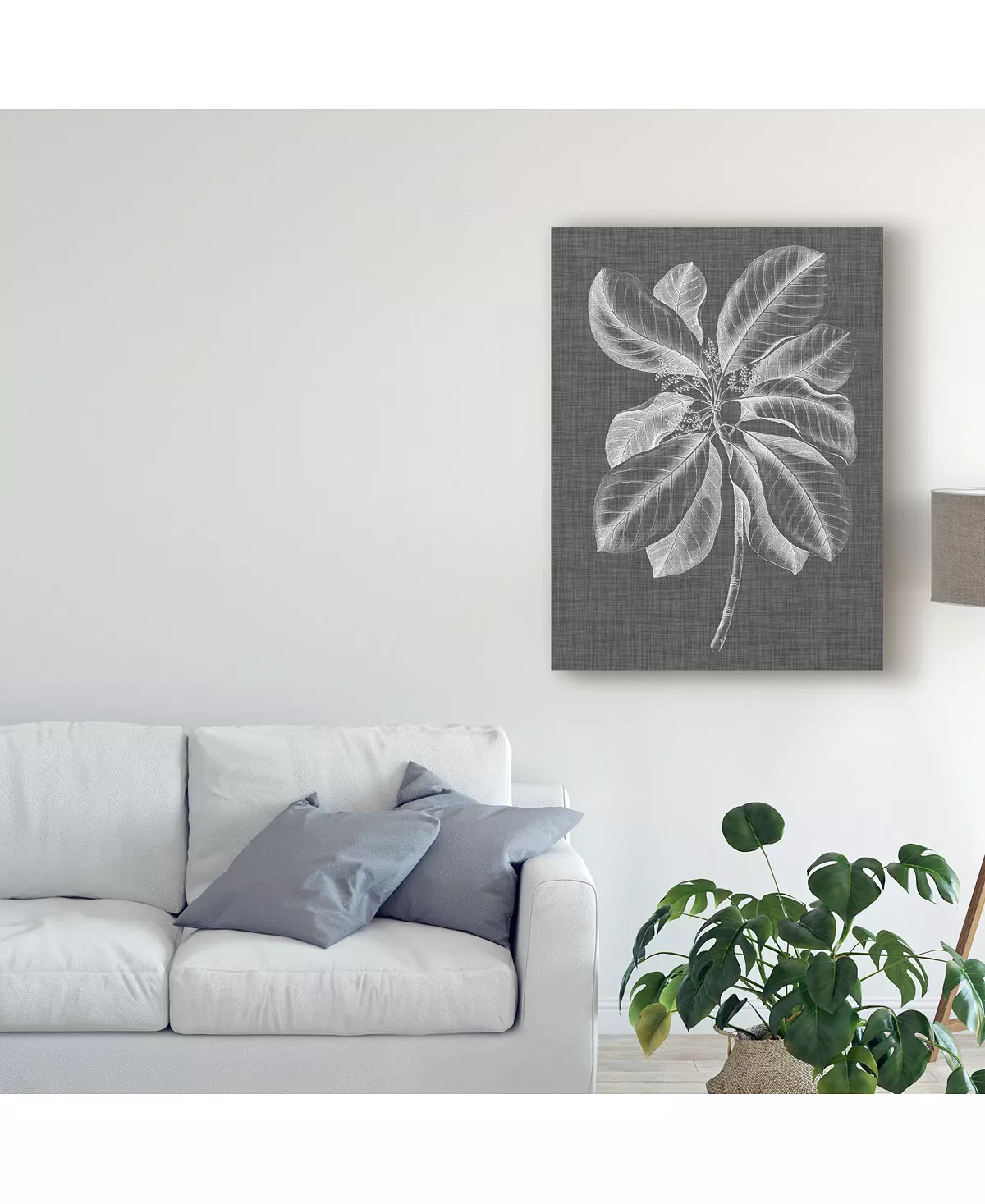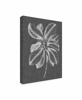 This ready to hang, gallery-wrapped art piece features a white illustration of a leafy plant on deep grey linen. Gallery-wrap is a method of wrapping an artist’s canvas around a hidden, wooden frame allowing for a frameless presentation.