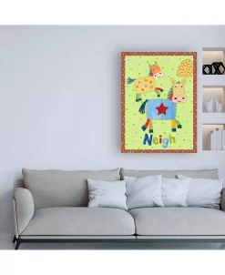 This ready to hang, gallery-wrapped art piece features happy animals in a children’s composition. Gallery-wrap is a method of wrapping an artist’s canvas around a hidden, wooden frame allowing for a frameless presentation.