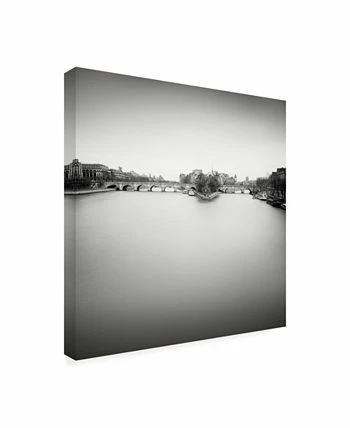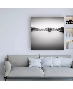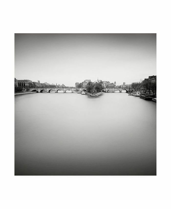 This ready to hang, gallery-wrapped art piece features a photograph of a bridge running across the center of the frame. Gallery-wrap is a method of wrapping an artist’s canvas around a hidden, wooden frame allowing for a frameless presentation.