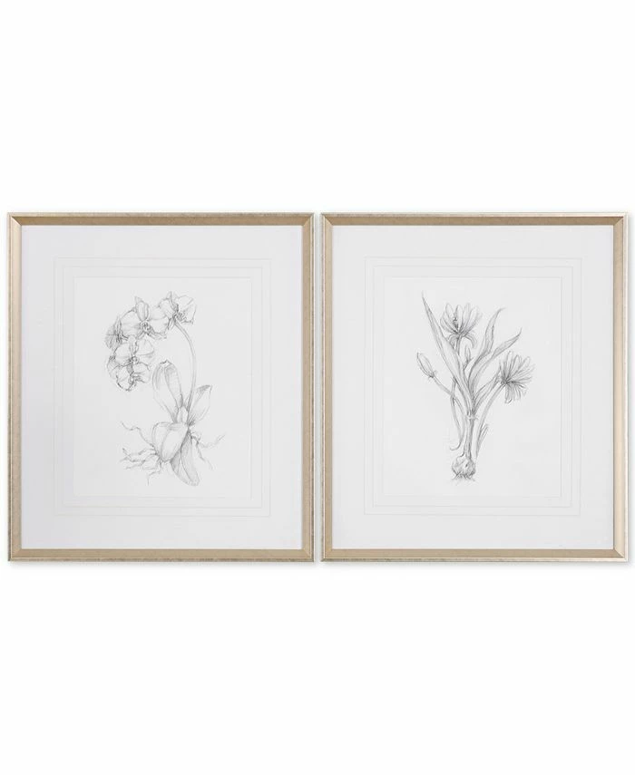 Simple lines and a refined palette define the Botanical Sketches printed wall art set by Uttermost, accented with white mats and silver-leaf-trimmed frames.