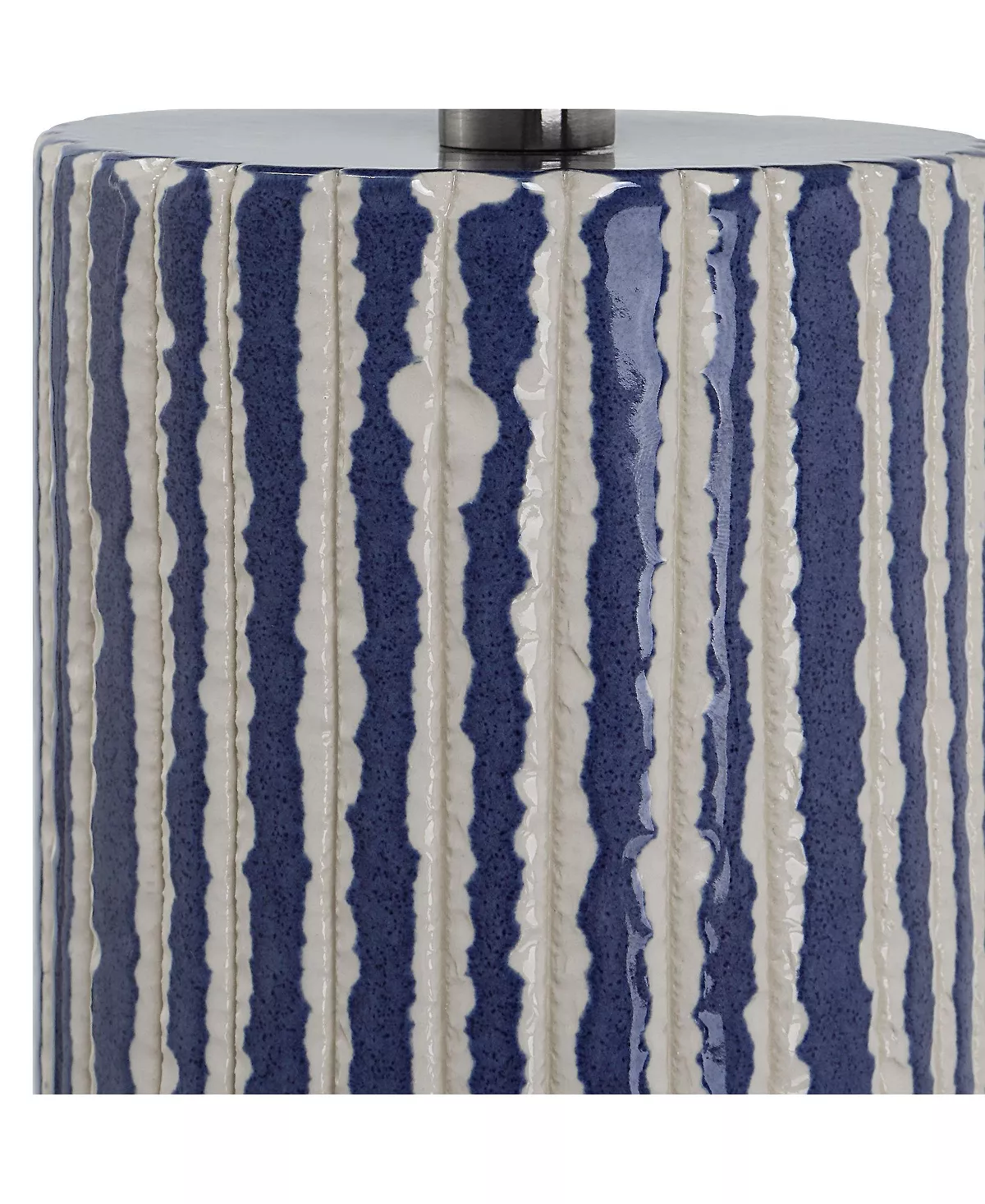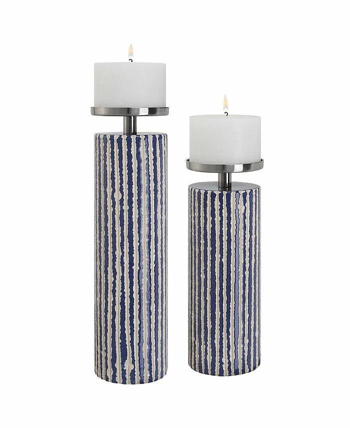 Set of two ceramic candleholders are finished in a vertically striped ivory and cobalt glaze, accented by iron candle cups finished in polished nickel with two 4″ x 3″ distressed off-white candles included.