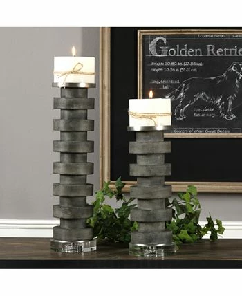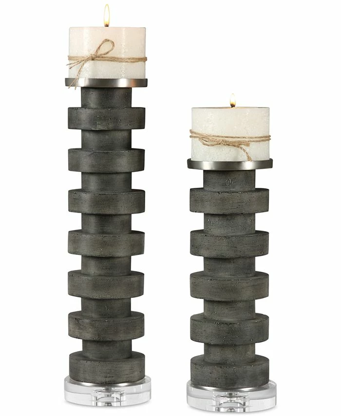 Rising from the clear crystal bases of this pair of Karun Candleholders from Uttermost are cylindrical staggered columns executed in charcoal stained concrete which present a look that is elegant and strong.