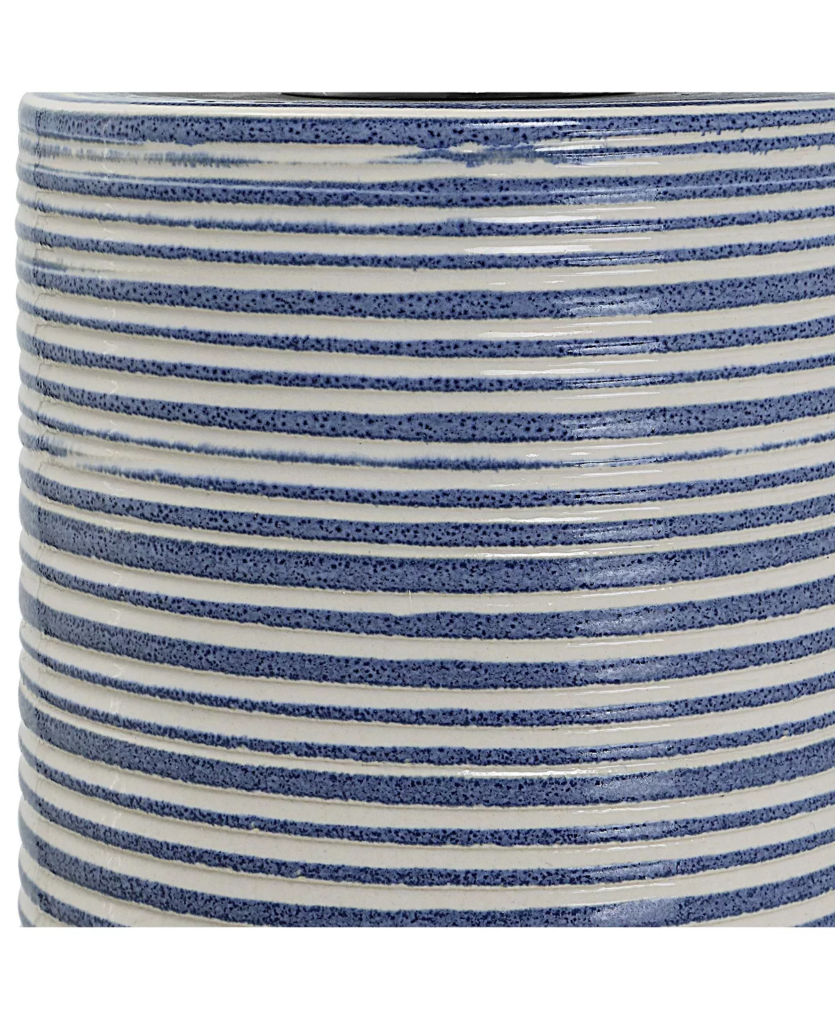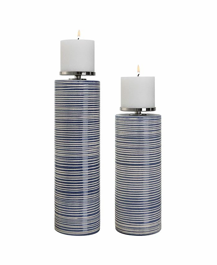 Showcasing trendy white and indigo hues, these ceramic candleholders display a horizontally striped glaze with polished nickel candle cups. Two 3″ x 3″ distressed white candles included.