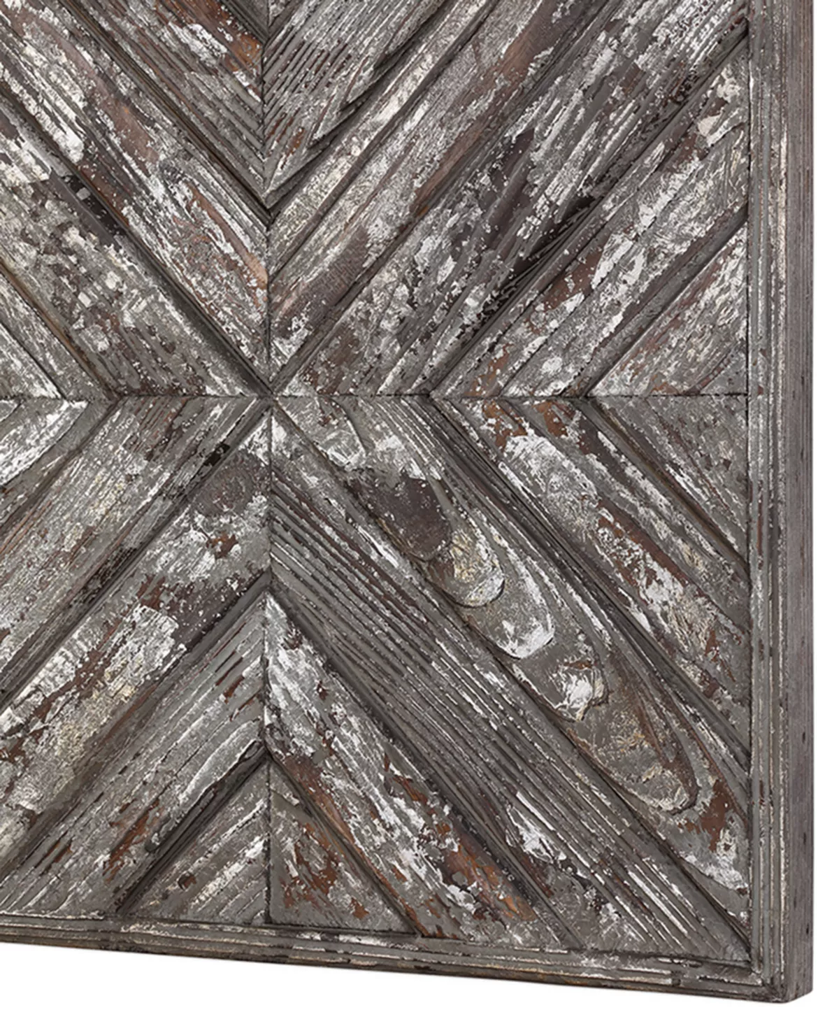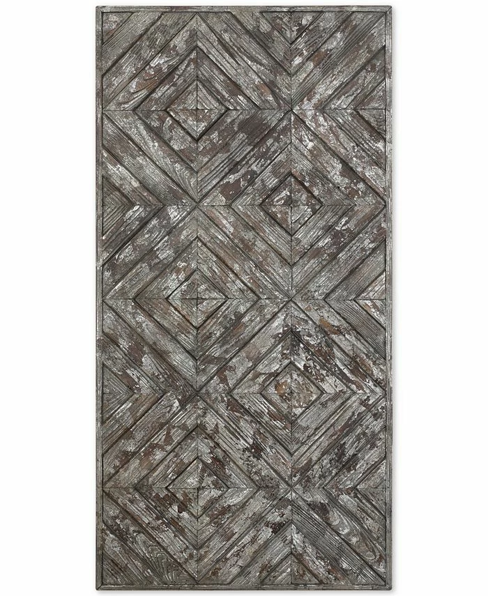 Handsomely distressed, raised and recessed fir panels create the dimensional diagonal pattern of Uttermost’s Roland wood panel wall art in a dark walnut finsh with metallic antiqued gold-tone highlights.